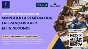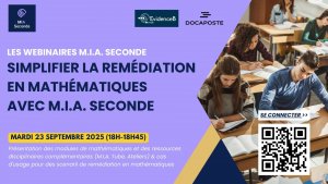 La Délégation du numérique pour l’éducation (DNE) organise une série de webinaires de M.I.A. seconde pour accompagner et faciliter la prise en main de la ressource. Leur suivi constituera un appui précieux pour les équipes pédagogiques alors même que débutera la période de passation du test de positionnement DEPP en classe de seconde.